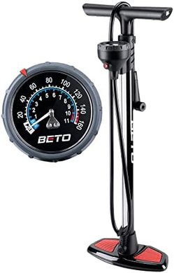 The Beto Bike Pump Portable is a high-performance floor pump perfect for cyclists seeking precision and ease of use. Its industrial-grade, 2.5” top-mounted gauge ensures accurate inflation up to 160 PSI, while a convenient air bleed button allows for fine adjustments. The patented AH4 auto-head effortlessly connects to both Schrader and Presta valves, eliminating the need for adjustments. A generous 47.2-inch air hose provides ample reach, and the robust steel construction, complete with an ergonomic handle, guarantees durability. Conveniently store the included ball needle in the handle for inflating other items. Manufactured by BETO, a world-leading cycling components producer, this pump offers superior quality and performance.